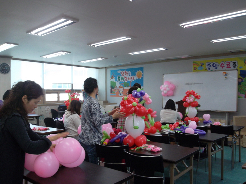 입학 축하 현수막과 함께 장식할 커다란 기둥풍선과 꽃, 나비 등을 만드는 증거운 시간이였다.